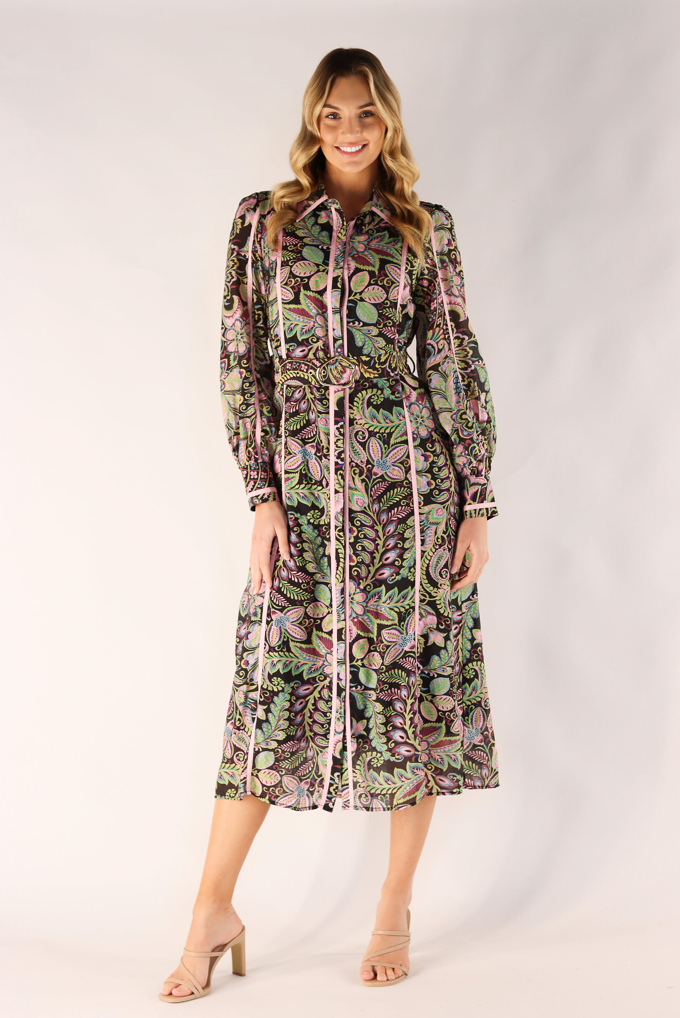 This elegant Natalie Midi Dress is sure to impress with its figure-flattering midi style and breathable fabric. Its special feature includes beautiful pink stripes, golden buckle, making it a perfect choice for any occasion. Complete your look by styling it with matching accessories for a polished and chic look.
