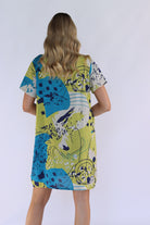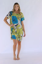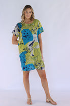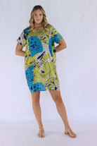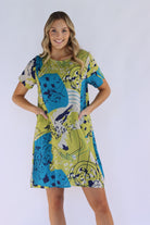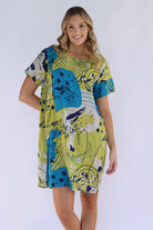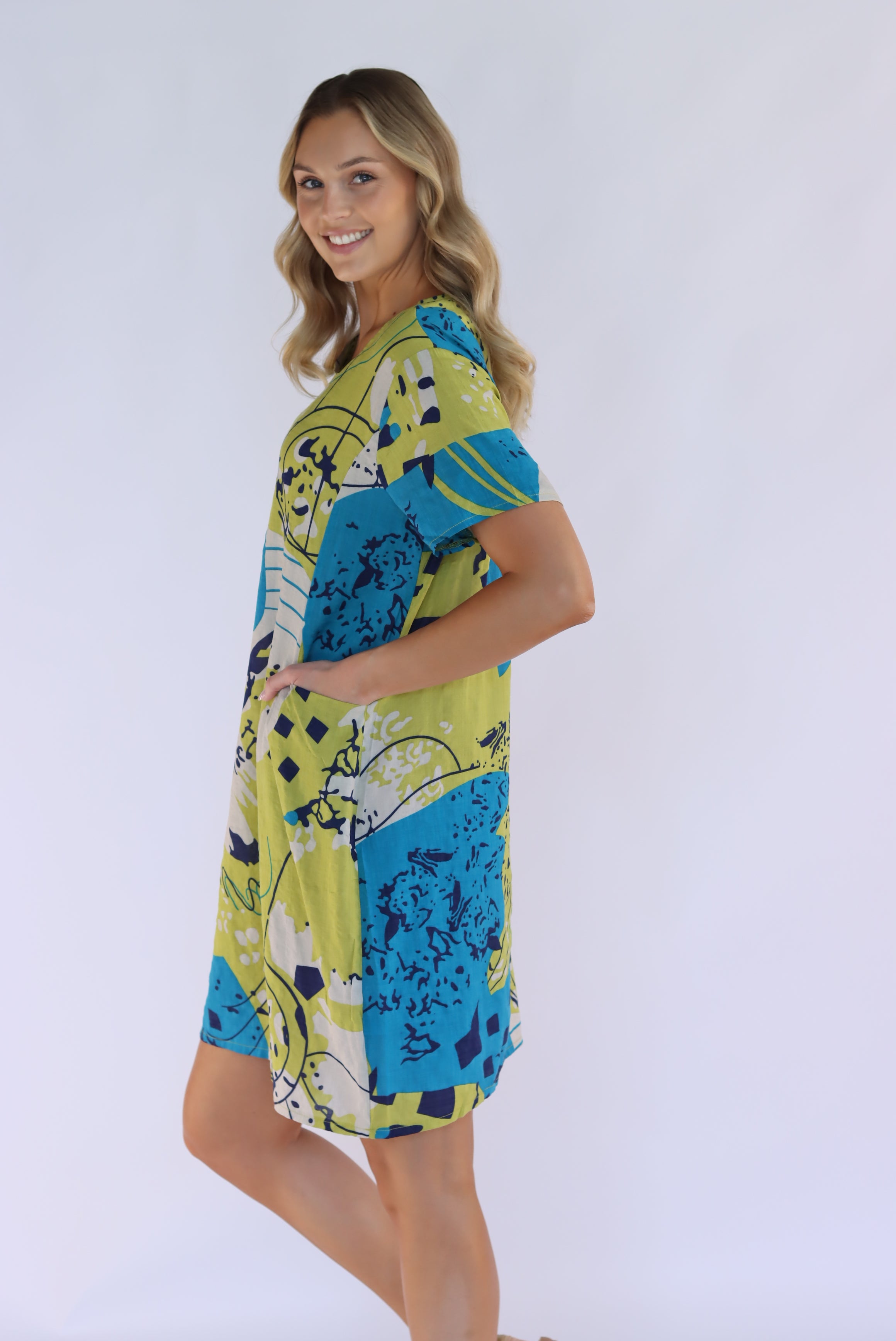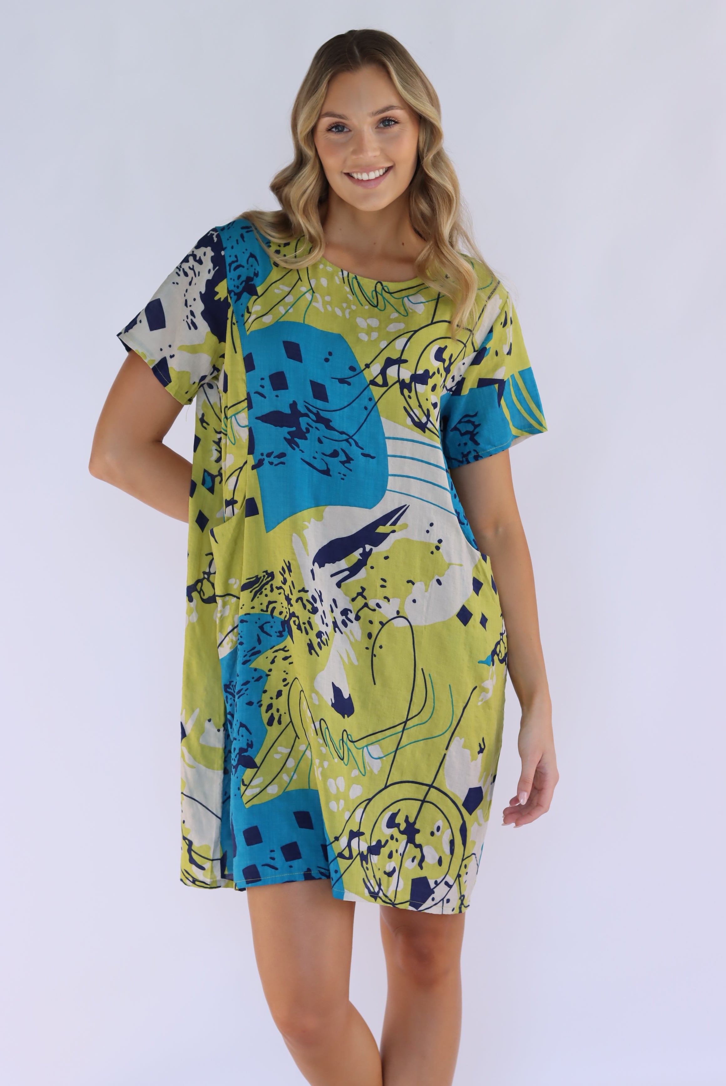 Our abstract shift dress features a round neckline and short sleeves, making it both stylish yet comfortable. The functional side pockets offer convenience, while the abstract print adds a touch of uniqueness. With its loose fit and short length, this unlined dress is perfect for a casual day out.