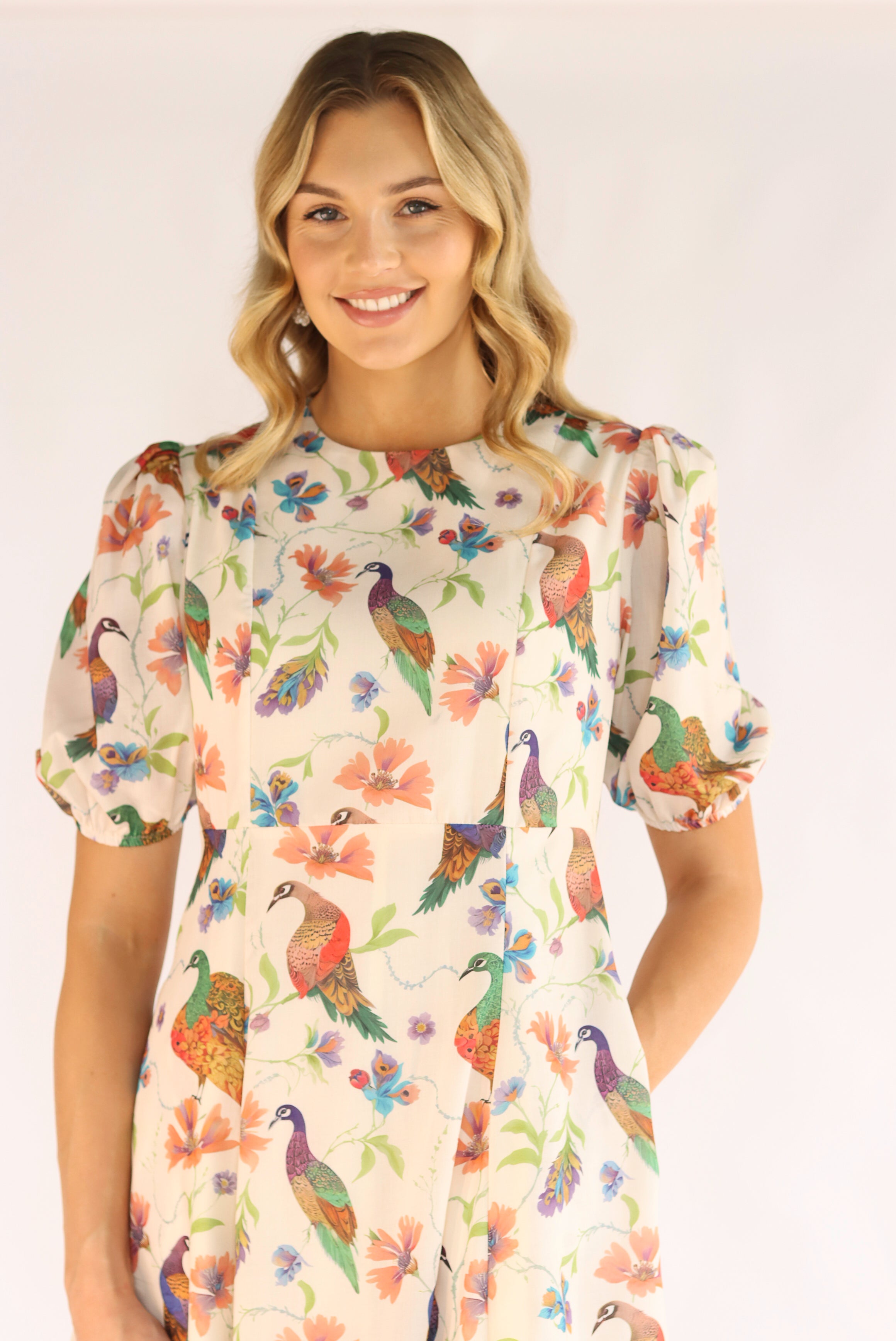 Embrace your love for nature in this Elegant Nature Lover Midi Dress. Its beautiful eye-catching bird print will make you stand out, while the midi style and long back zipper provide a stylish fit. Plus, the side pockets add convenience to your on-the-go lifestyle.