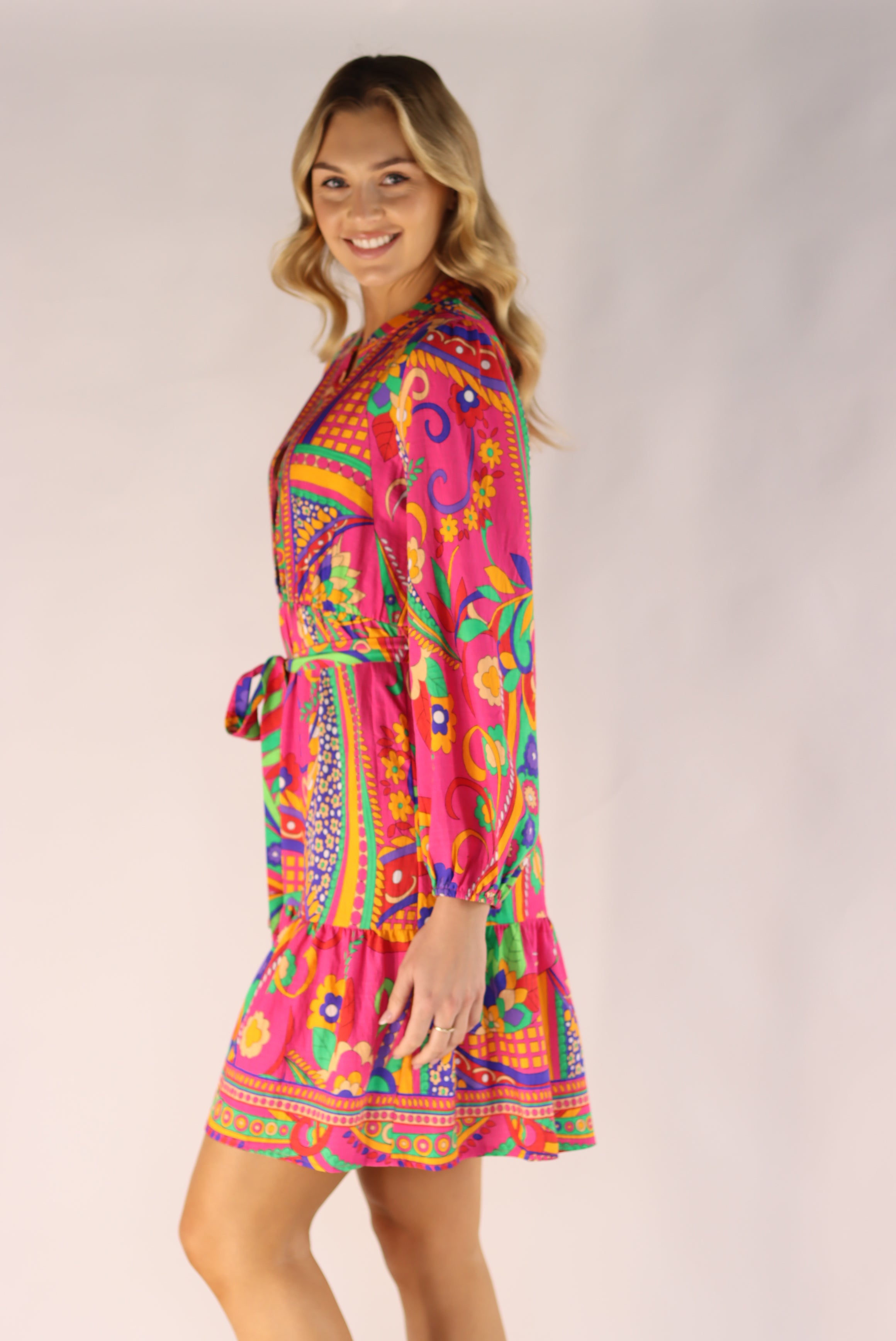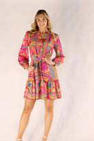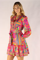 Introducing the Everly Vibrant Pink Knee Dress. Made from silky viscose fabric, this stunning dress features a unique print and flattering cut. With vibrant colors and convenient side pockets, you'll be sure to turn heads and feel your best in this dress.